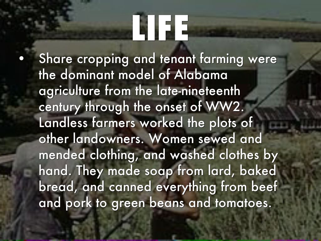 • Share cropping and tenant farming were the dominant model of Alabama agriculture from the late-nineteenth century through the onset of WW2. Landless farmers worked the plots of other landowners. Women sewed and mended clothing, and washed clothes by hand. They made soap from lard, baked bread, and canned everything from beef and pork to green beans and tomatoes.