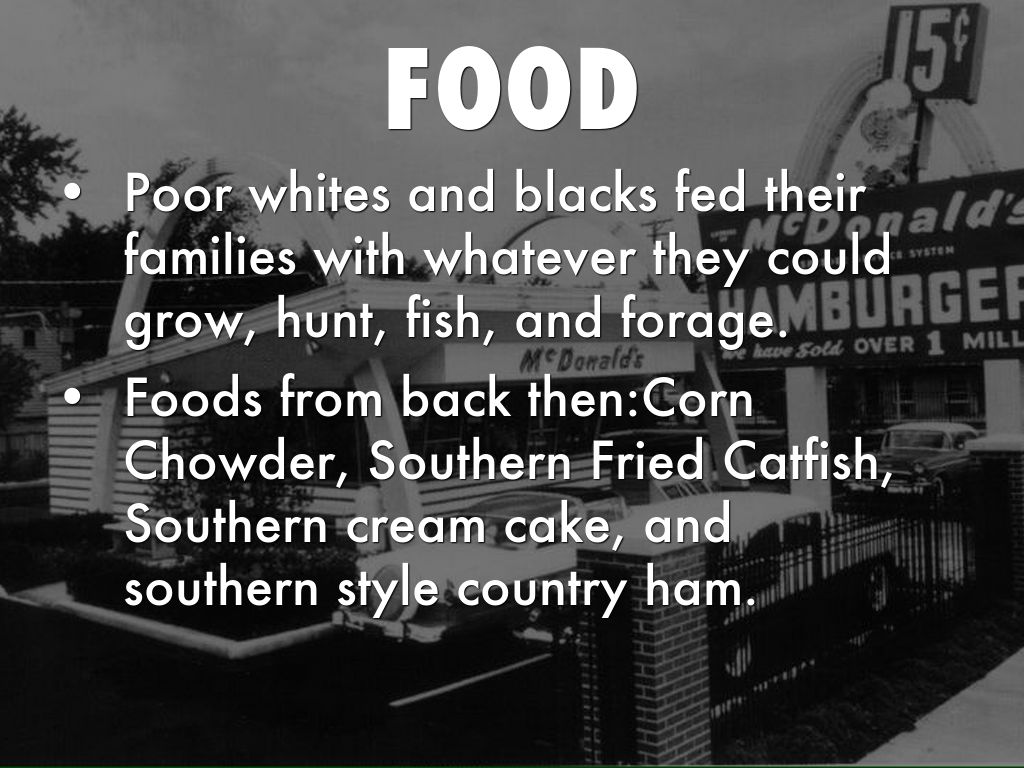 • Foods from back then:Corn Chowder, Southern Fried Catfish, Southern cream cake, and southern style country ham.
