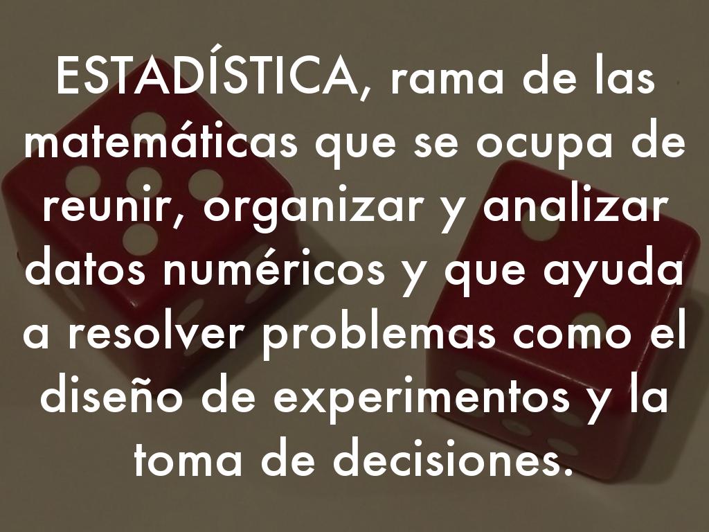ESTADÍSTICA, rama de las matemáticas que se ocupa de reunir, organizar y analizar datos numéricos y que ayuda a resolver problemas como el diseño de experimentos y la toma de decisiones.