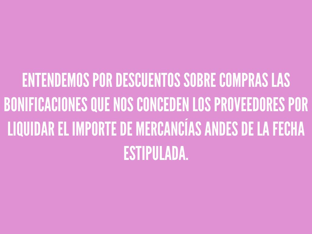 ENTENDEMOS POR DESCUENTOS SOBRE COMPRAS LAS BONIFICACIONES QUE NOS CONCEDEN LOS PROVEEDORES POR LIQUIDAR EL IMPORTE DE MERCANCÍAS ANDES DE LA FECHA ESTIPULADA.
