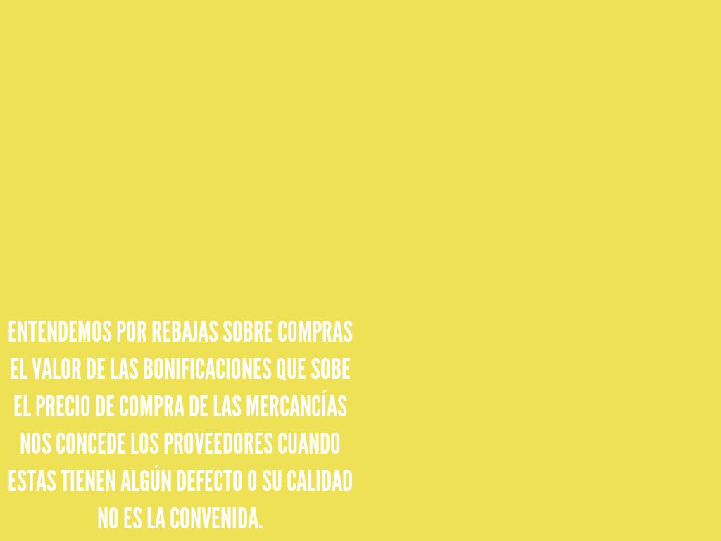 ENTENDEMOS POR REBAJAS SOBRE COMPRAS EL VALOR DE LAS BONIFICACIONES QUE SOBE EL PRECIO DE COMPRA DE LAS MERCANCÍAS NOS CONCEDE LOS PROVEEDORES CUANDO ESTAS TIENEN ALGÚN DEFECTO O SU CALIDAD NO ES LA CONVENIDA.