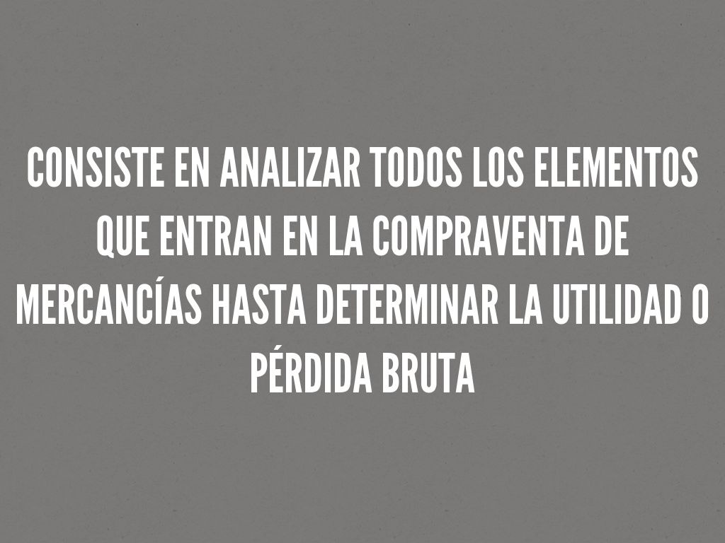 CONSISTE EN ANALIZAR TODOS LOS ELEMENTOS QUE ENTRAN EN LA COMPRAVENTA DE MERCANCÍAS HASTA DETERMINAR LA UTILIDAD O PÉRDIDA BRUTA