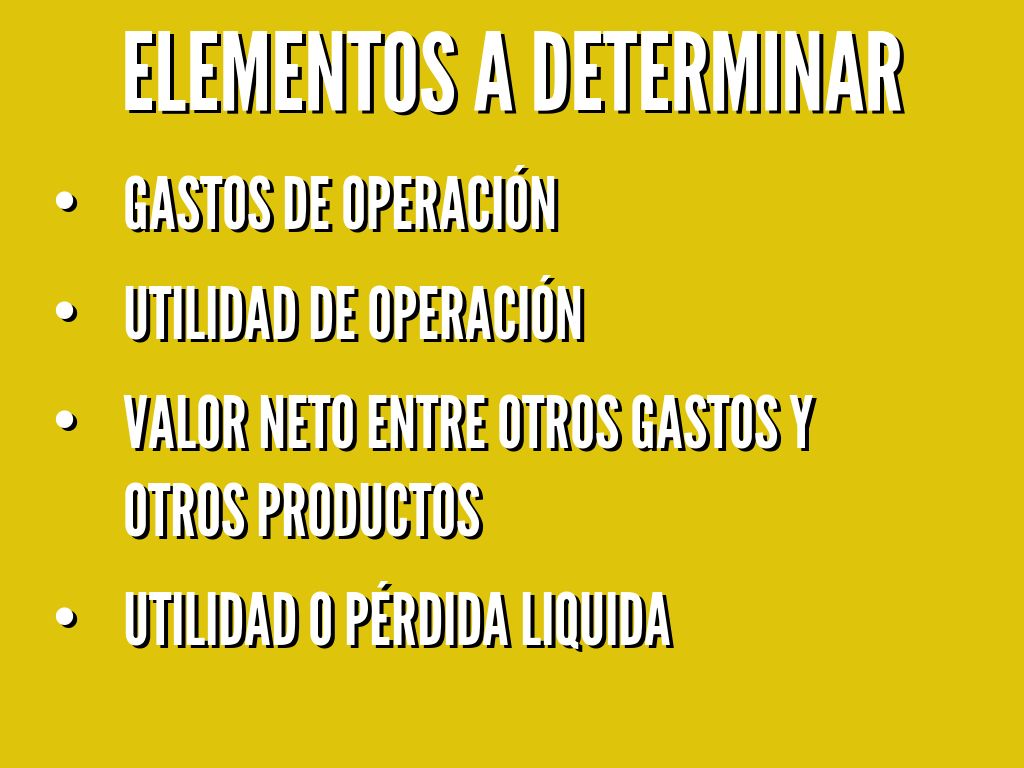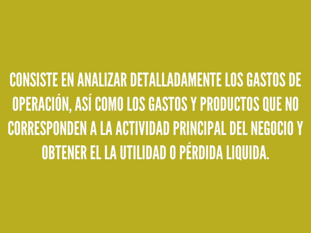 CONSISTE EN ANALIZAR DETALLADAMENTE LOS GASTOS DE OPERACIÓN, ASÍ COMO LOS GASTOS Y PRODUCTOS QUE NO CORRESPONDEN A LA ACTIVIDAD PRINCIPAL DEL NEGOCIO Y OBTENER EL LA UTILIDAD O PÉRDIDA LIQUIDA.
