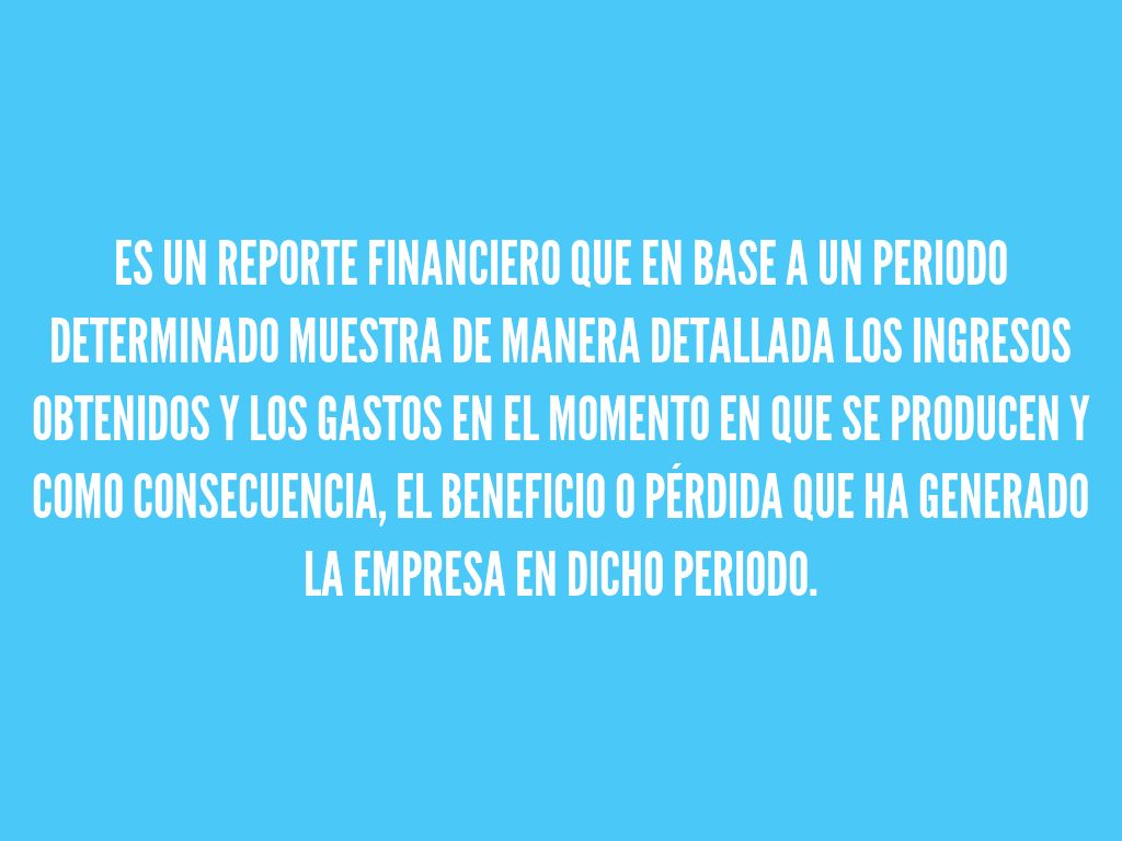 ES UN REPORTE FINANCIERO QUE EN BASE A UN PERIODO DETERMINADO MUESTRA DE MANERA DETALLADA LOS INGRESOS OBTENIDOS Y LOS GASTOS EN EL MOMENTO EN QUE SE PRODUCEN Y COMO CONSECUENCIA, EL BENEFICIO O PÉRDIDA QUE HA GENERADO LA EMPRESA EN DICHO PERIODO.