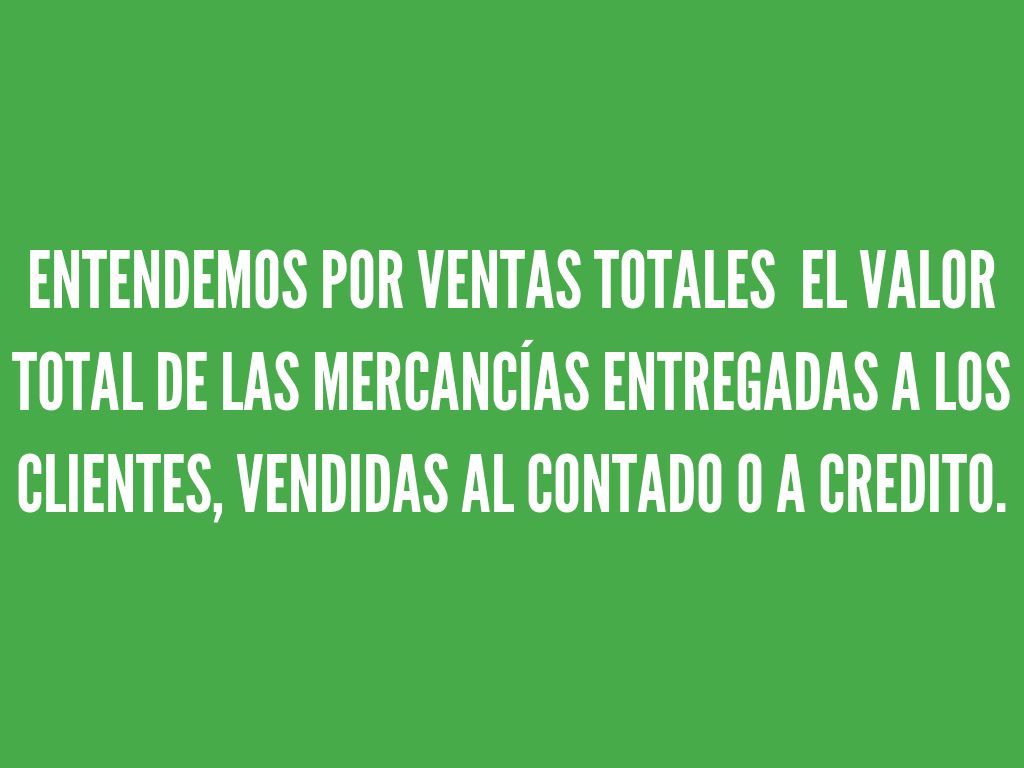 ENTENDEMOS POR VENTAS TOTALES EL VALOR TOTAL DE LAS MERCANCÍAS ENTREGADAS A LOS CLIENTES, VENDIDAS AL CONTADO O A CREDITO.