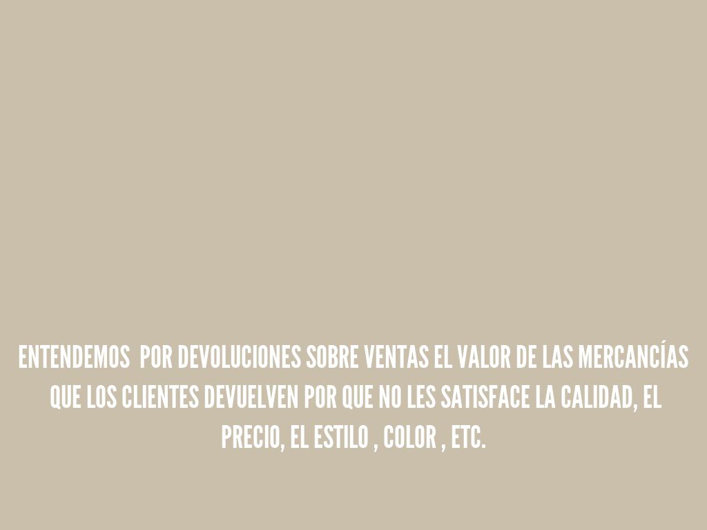 ENTENDEMOS POR DEVOLUCIONES SOBRE VENTAS EL VALOR DE LAS MERCANCÍAS QUE LOS CLIENTES DEVUELVEN POR QUE NO LES SATISFACE LA CALIDAD, EL PRECIO, EL ESTILO , COLOR , ETC.