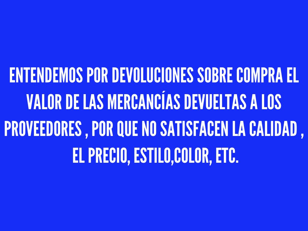 ENTENDEMOS POR DEVOLUCIONES SOBRE COMPRA EL VALOR DE LAS MERCANCÍAS DEVUELTAS A LOS PROVEEDORES , POR QUE NO SATISFACEN LA CALIDAD , EL PRECIO, ESTILO,COLOR, ETC.
