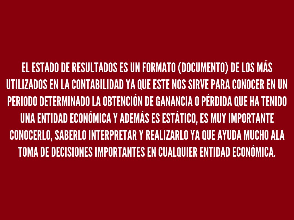 EL ESTADO DE RESULTADOS ES UN FORMATO (DOCUMENTO) DE LOS MÁS UTILIZADOS EN LA CONTABILIDAD YA QUE ESTE NOS SIRVE PARA CONOCER EN UN PERIODO DETERMINADO LA OBTENCIÓN DE GANANCIA O PÉRDIDA QUE HA TENIDO UNA ENTIDAD ECONÓMICA Y ADEMÁS ES ESTÁTICO, ES MUY IMPORTANTE CONOCERLO, SABERLO INTERPRETAR Y REALIZARLO YA QUE AYUDA MUCHO ALA TOMA DE DECISIONES IMPORTANTES EN CUALQUIER ENTIDAD ECONÓMICA.