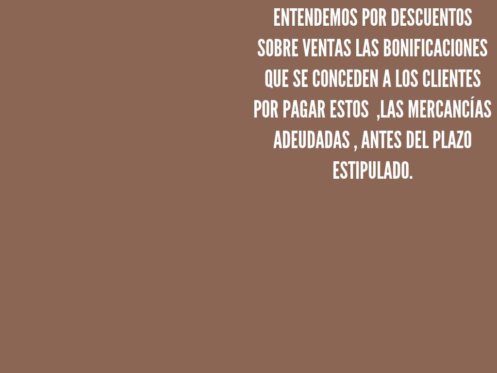 ENTENDEMOS POR DESCUENTOS SOBRE VENTAS LAS BONIFICACIONES QUE SE CONCEDEN A LOS CLIENTES POR PAGAR ESTOS ,LAS MERCANCÍAS ADEUDADAS , ANTES DEL PLAZO ESTIPULADO.