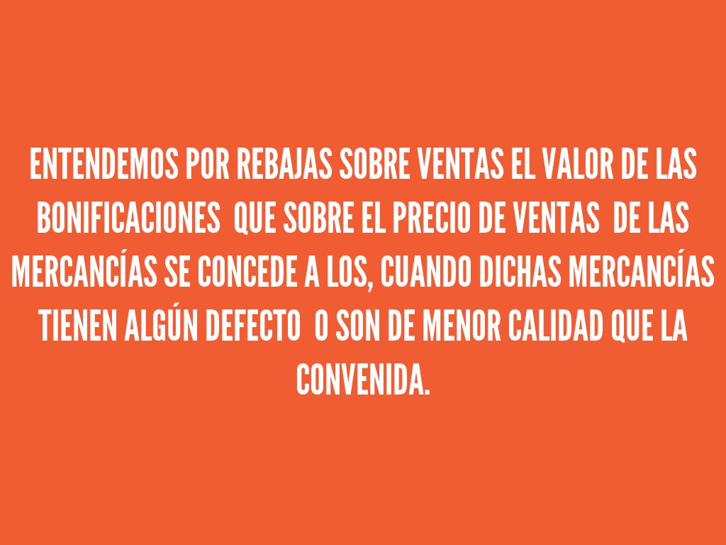 ENTENDEMOS POR REBAJAS SOBRE VENTAS EL VALOR DE LAS BONIFICACIONES QUE SOBRE EL PRECIO DE VENTAS DE LAS MERCANCÍAS SE CONCEDE A LOS, CUANDO DICHAS MERCANCÍAS TIENEN ALGÚN DEFECTO O SON DE MENOR CALIDAD QUE LA CONVENIDA.