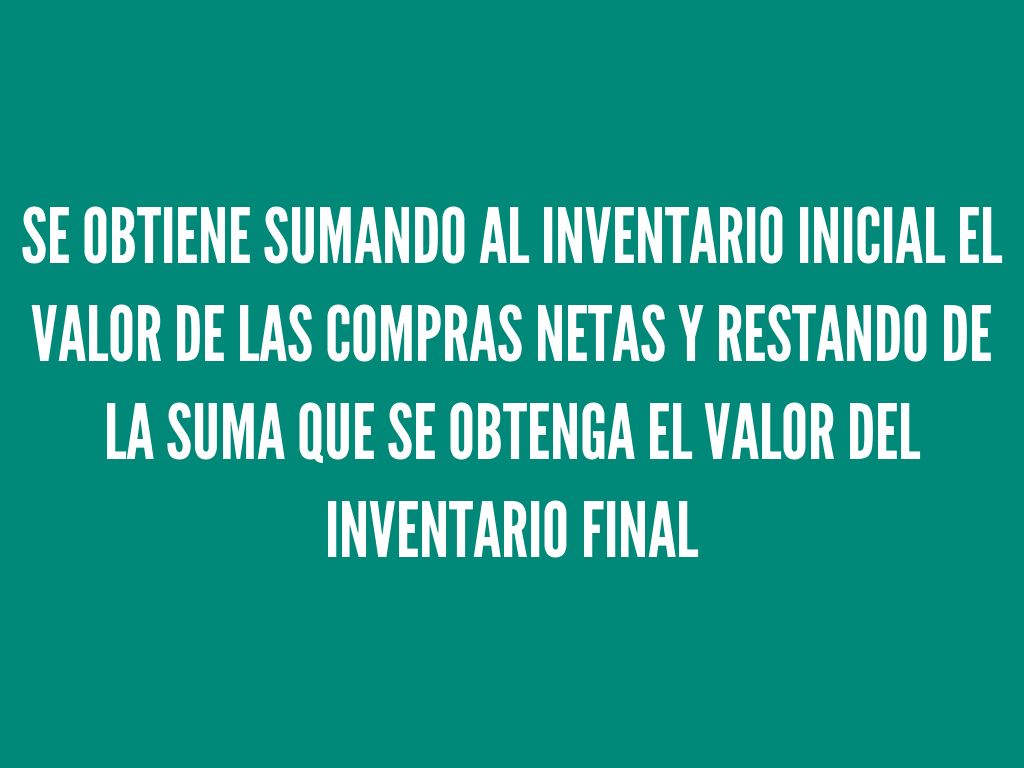 SE OBTIENE SUMANDO AL INVENTARIO INICIAL EL VALOR DE LAS COMPRAS NETAS Y RESTANDO DE LA SUMA QUE SE OBTENGA EL VALOR DEL INVENTARIO FINAL
