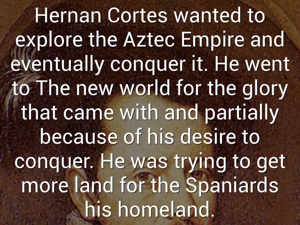 Hernan Cortes wanted to explore the Aztec Empire and eventually conquer it. He went to The new world for the glory that came with and partially because of his desire to conquer. He was trying to get more land for the Spaniards his homeland.