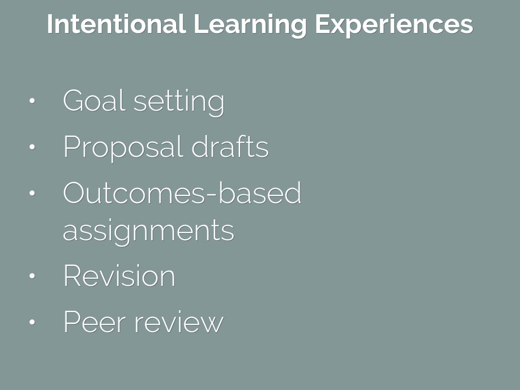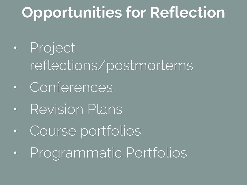• Current assessment plans include student self-efficacy inventories, expanded portfolio collection, interviews and focus groups with previous portfolio participants, and a review of collected documents and reflections