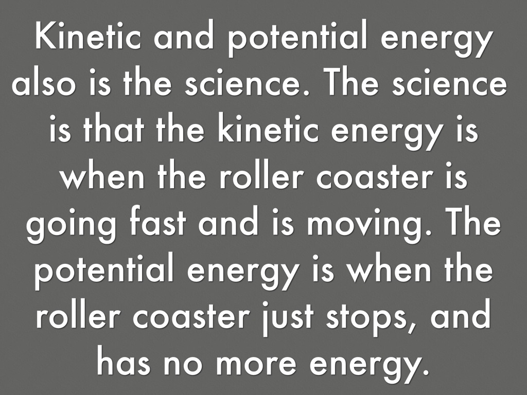 Kinetic and potential energy also is the science. The science is that the kinetic energy is when the roller coaster is going fast and is moving. The potential energy is when the roller coaster just stops, and has no more energy.