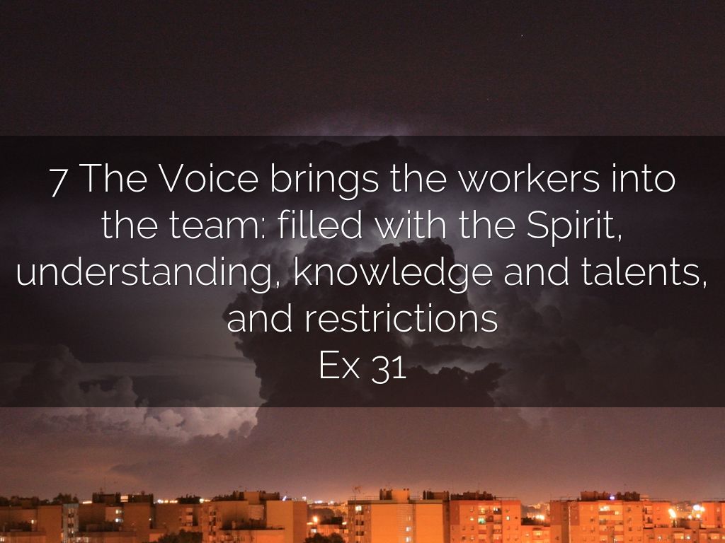 7 The Voice brings the workers into the team: filled with the Spirit, understanding, knowledge and talents, and restrictions