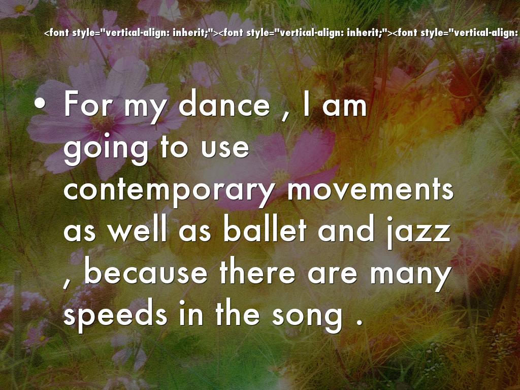 For my dance , I am going to use contemporary movements as well as ballet and jazz , because there are many speeds in the song .