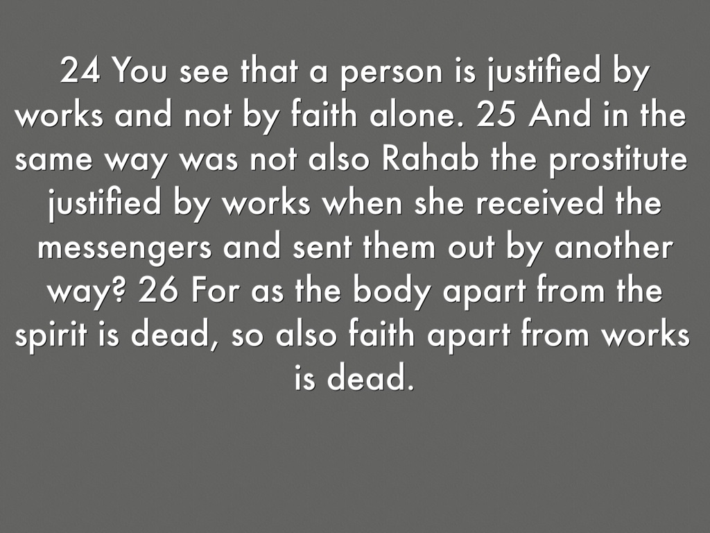 24 You see that a person is justified by works and not by faith alone. 25 And in the same way was not also Rahab the prostitute justified by works when she received the messengers and sent them out by another way? 26 For as the body apart from the spirit is dead, so also faith apart from works is dead.