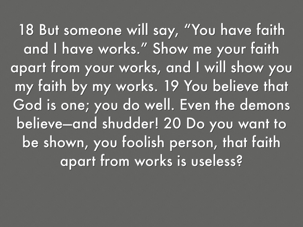 18 But someone will say, “You have faith and I have works.” Show me your faith apart from your works, and I will show you my faith by my works. 19 You believe that God is one; you do well. Even the demons believe—and shudder! 20 Do you want to be shown, you foolish person, that faith apart from works is useless?