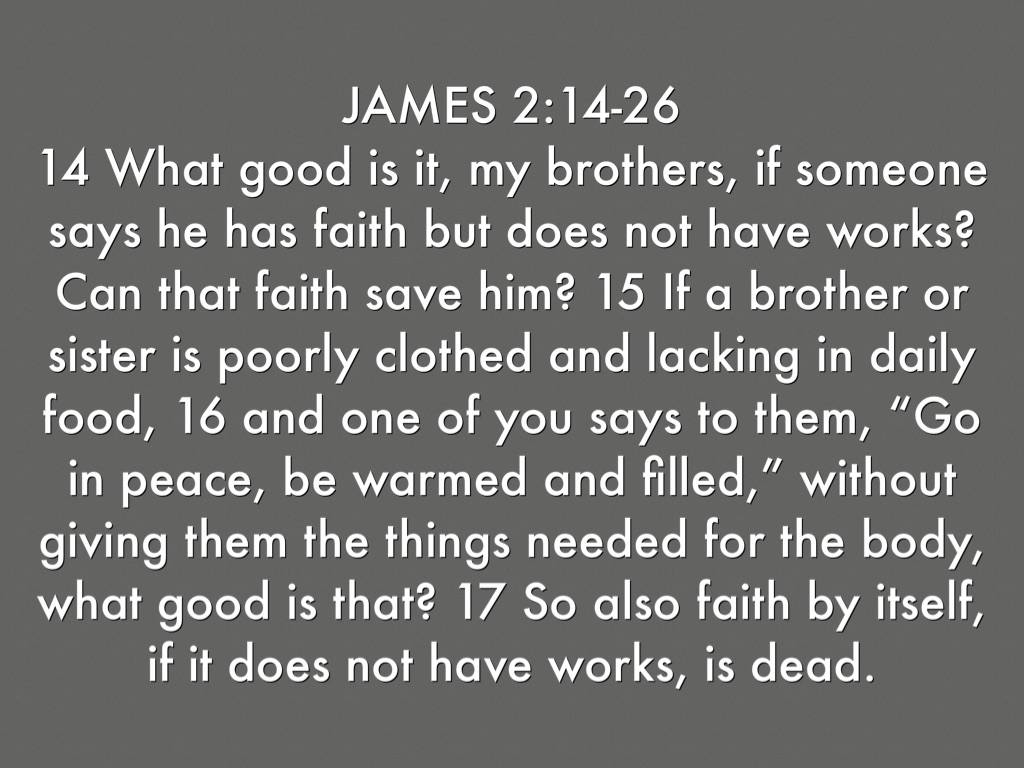 14 What good is it, my brothers, if someone says he has faith but does not have works? Can that faith save him? 15 If a brother or sister is poorly clothed and lacking in daily food, 16 and one of you says to them, “Go in peace, be warmed and filled,” without giving them the things needed for the body, what good is that? 17 So also faith by itself, if it does not have works, is dead.