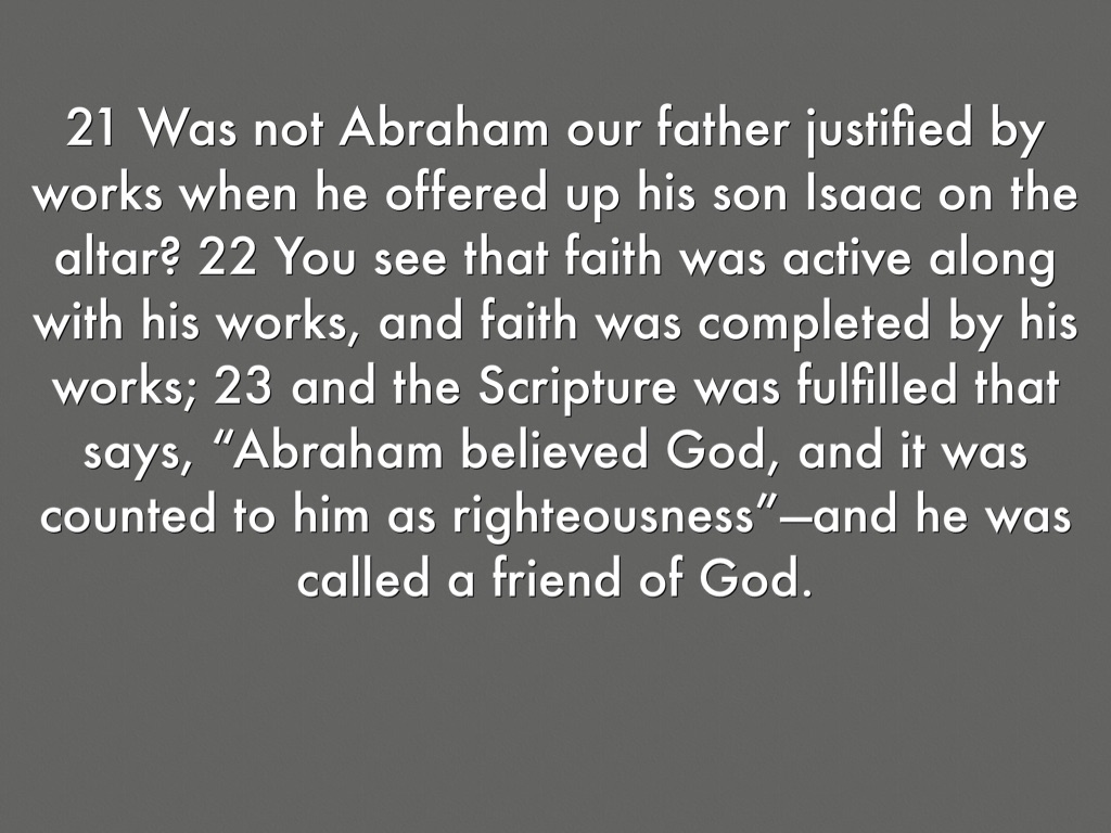 21 Was not Abraham our father justified by works when he offered up his son Isaac on the altar? 22 You see that faith was active along with his works, and faith was completed by his works; 23 and the Scripture was fulfilled that says, “Abraham believed God, and it was counted to him as righteousness”—and he was called a friend of God.