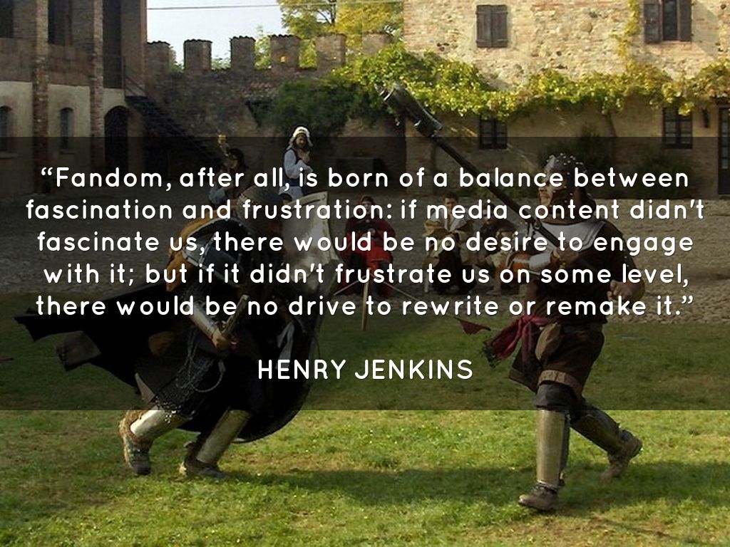 “Fandom, after all, is born of a balance between fascination and frustration: if media content didn't fascinate us, there would be no desire to engage with it; but if it didn't frustrate us on some level, there would be no drive to rewrite or remake it.”