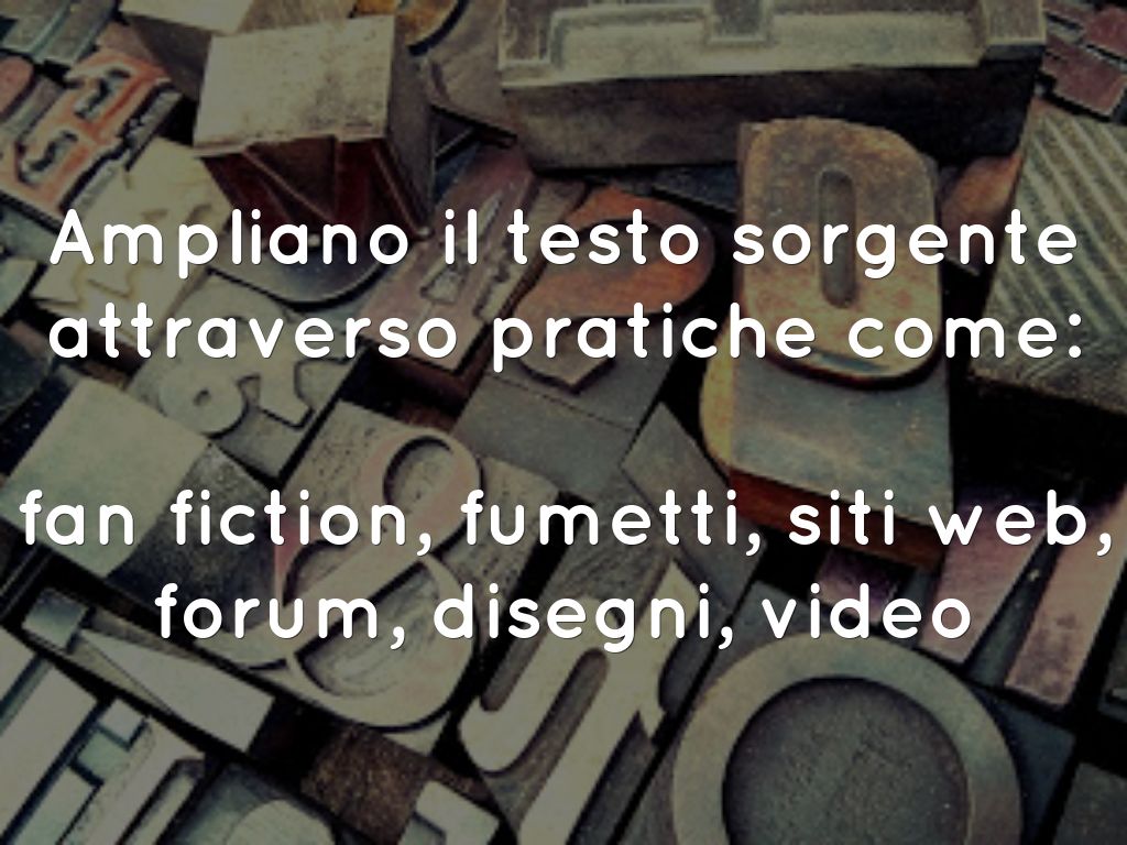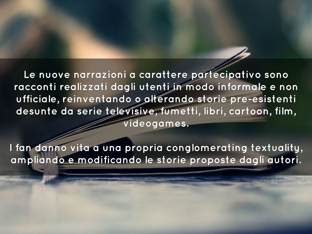 Le nuove narrazioni a carattere partecipativo sono racconti realizzati dagli utenti in modo informale e non ufficiale, reinventando o alterando storie pre-esistenti desunte da serie televisive, fumetti, libri, cartoon, film, videogames.