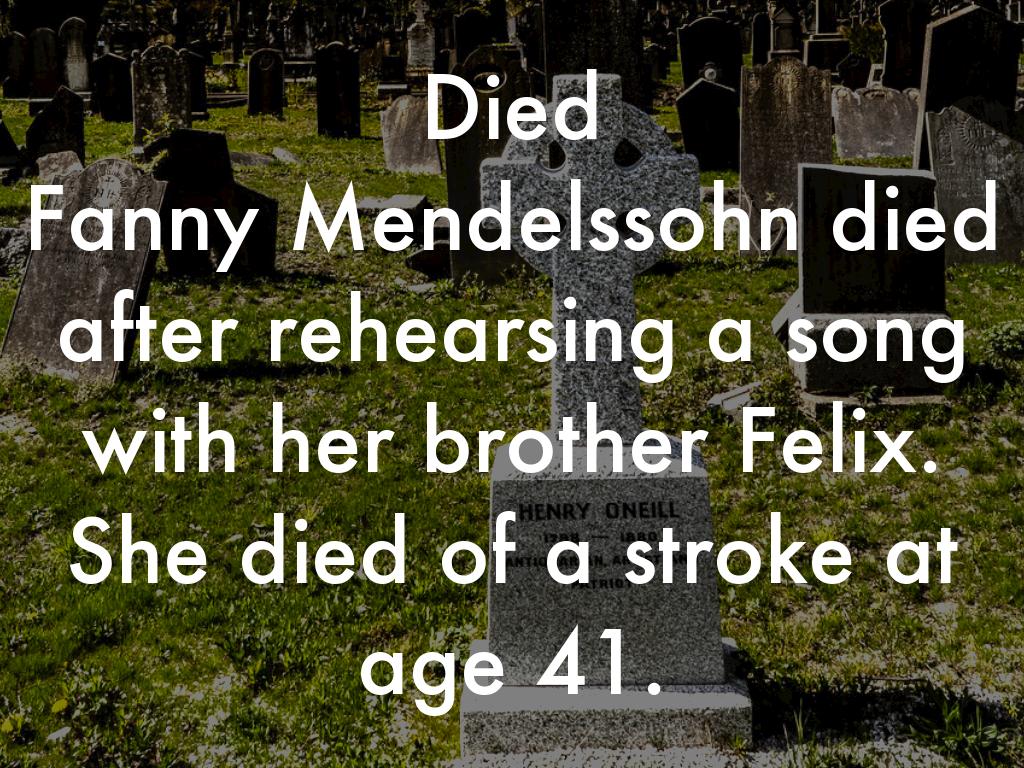 Fanny Mendelssohn died after rehearsing a song with her brother Felix. She died of a stroke at age 41.