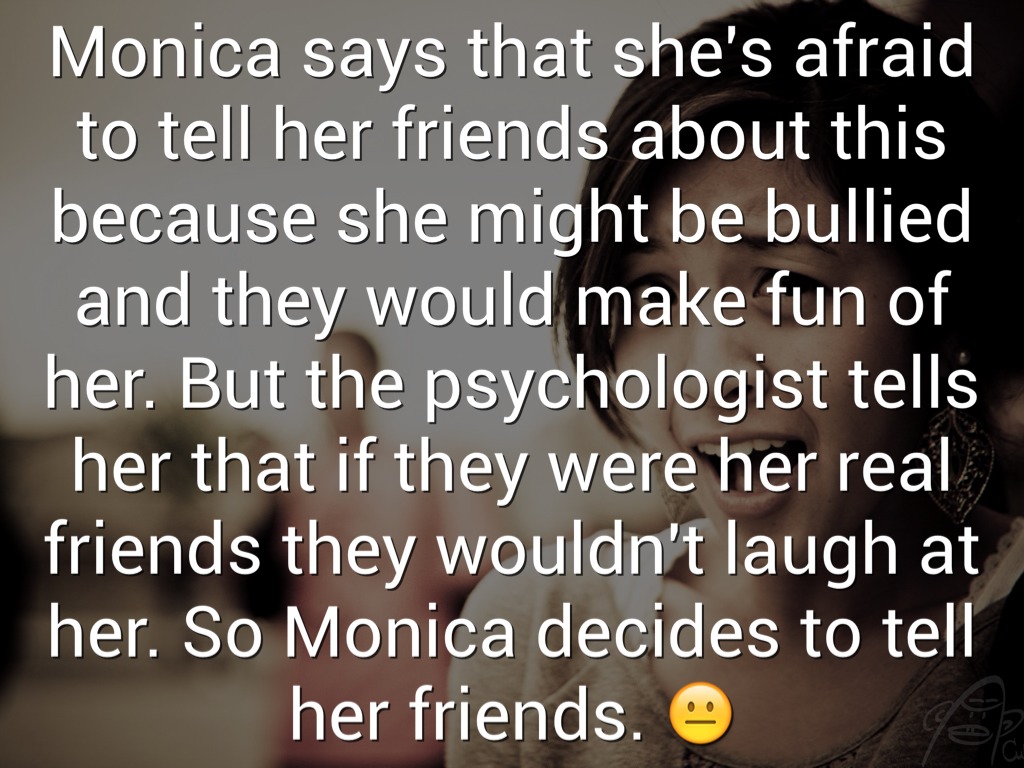 Monica says that she's afraid to tell her friends about this because she might be bullied and they would make fun of her. But the psychologist tells her that if they were her real friends they wouldn't laugh at her. So Monica decides to tell her friends. π