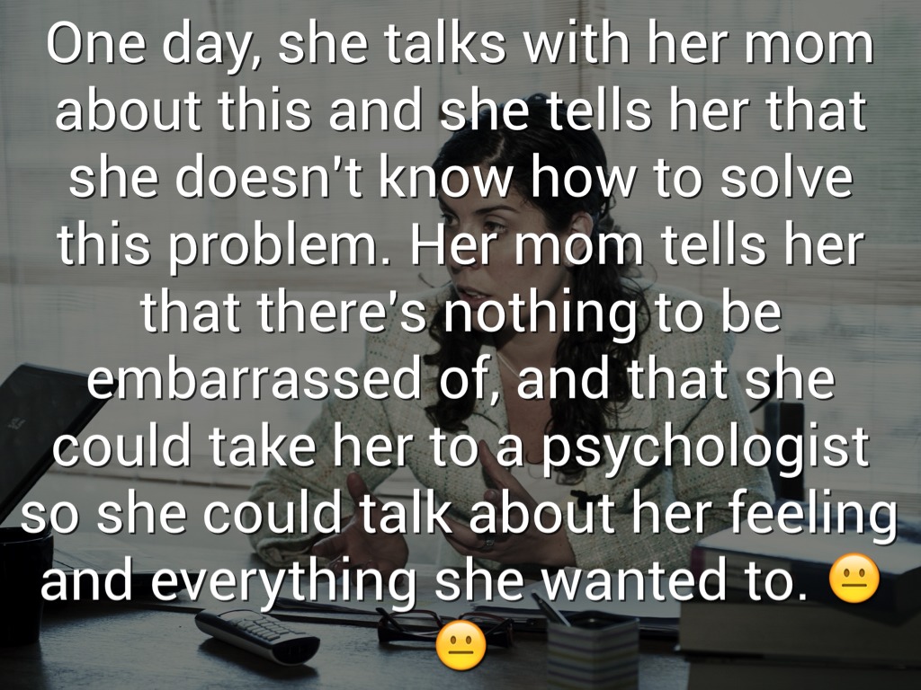 One day, she talks with her mom about this and she tells her that she doesn't know how to solve this problem. Her mom tells her that there's nothing to be embarrassed of, and that she could take her to a psychologist so she could talk about her feeling and everything she wanted to. ππ