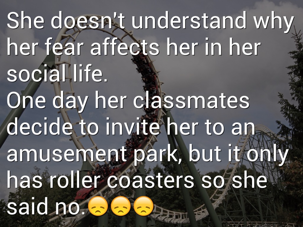 She doesn't understand why her fear affects her in her social life. One day her classmates decide to invite her to an amusement park, but it only has roller coasters so she said no.πππ