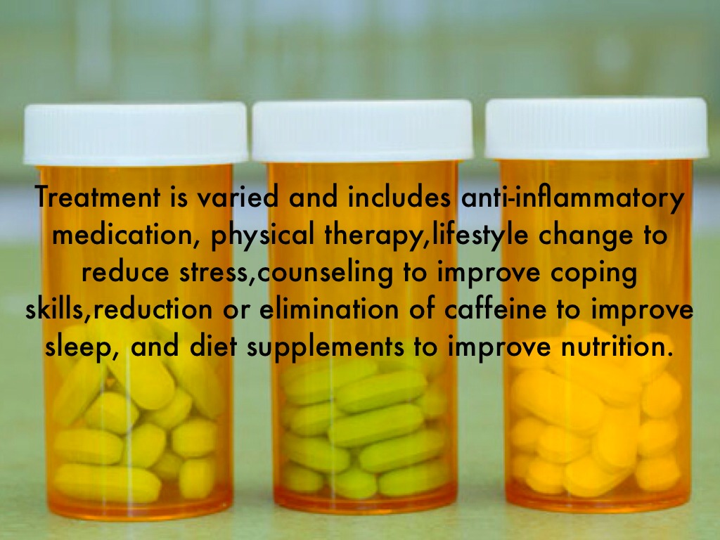 Treatment is varied and includes anti-inflammatory medication, physical therapy,lifestyle change to reduce stress,counseling to improve coping skills,reduction or elimination of caffeine to improve sleep, and diet supplements to improve nutrition.