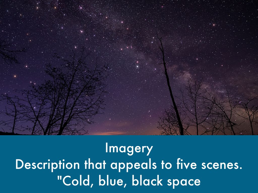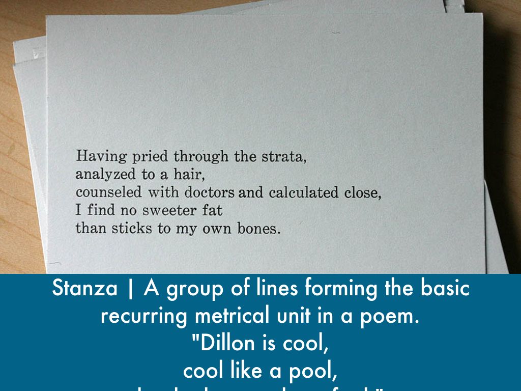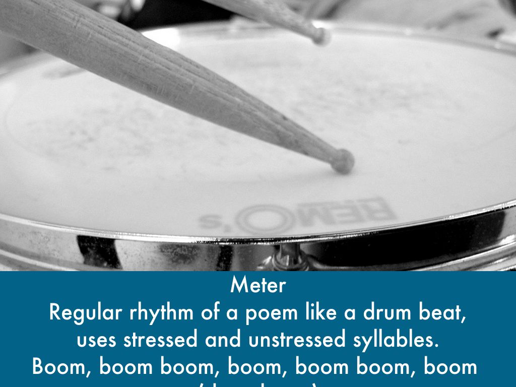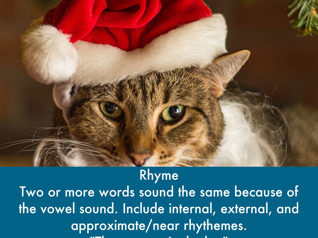 Rhyme Two or more words sound the same because of the vowel sound. Include internal, external, and approximate/near rhythemes. "The cat was in the hat"