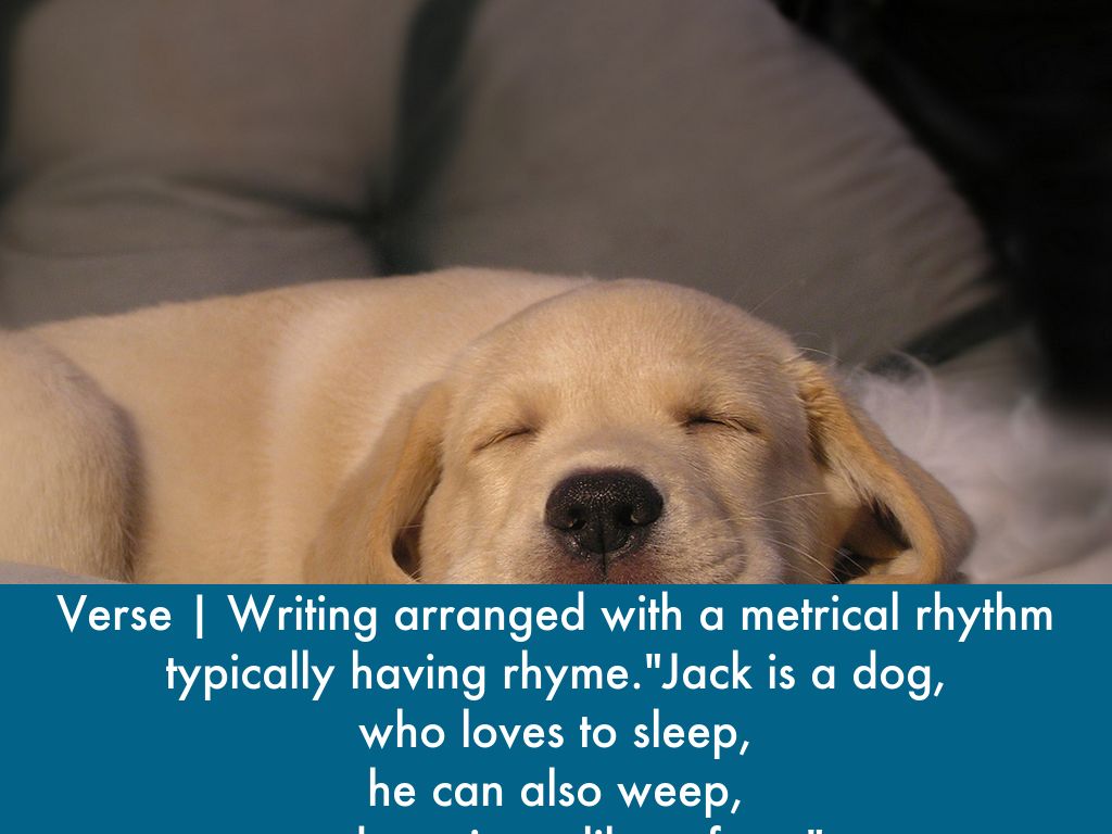 Verse | Writing arranged with a metrical rhythm typically having rhyme."Jack is a dog, who loves to sleep, he can also weep, and can jump like a frog."