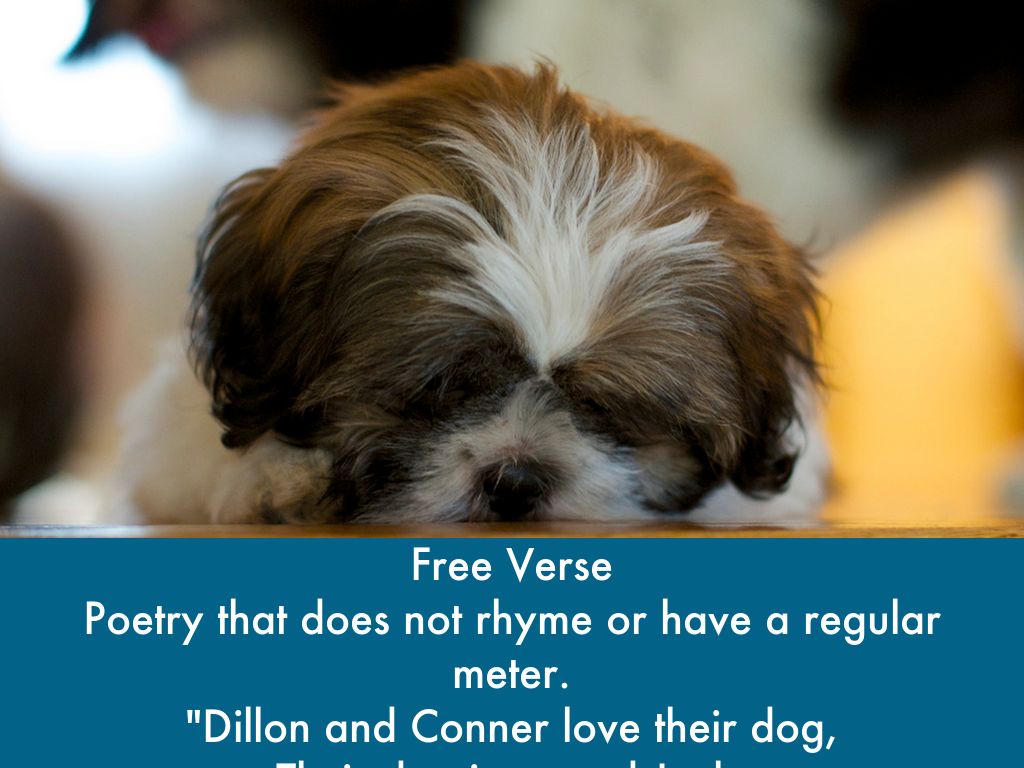 Free Verse Poetry that does not rhyme or have a regular meter. "Dillon and Conner love their dog, Their dog is named Jack, And he loves them back too."