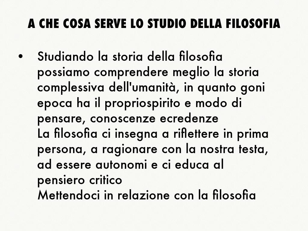 Studiando la storia della filosofia possiamo comprendere meglio la storia complessiva dell'umanità, in quanto goni epoca ha il propriospirito e modo di pensare, conoscenze ecredenze