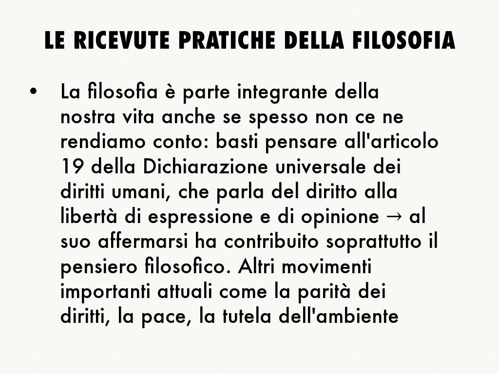La filosofia è parte integrante della nostra vita anche se spesso non ce ne rendiamo conto: basti pensare all'articolo 19 della Dichiarazione universale dei diritti umani, che parla del diritto alla libertà di espressione e di opinione → al suo affermarsi ha contribuito soprattutto il pensiero filosofico. Altri movimenti importanti attuali come la parità dei diritti, la pace, la tutela dell'ambiente fondanole proprie radici nella filosofia: persino la tragica pandemia contemporanea di Covid 19 ha suscitato in noi altre domande etiche e antropologiche, strettamente correlate alla filosofia.