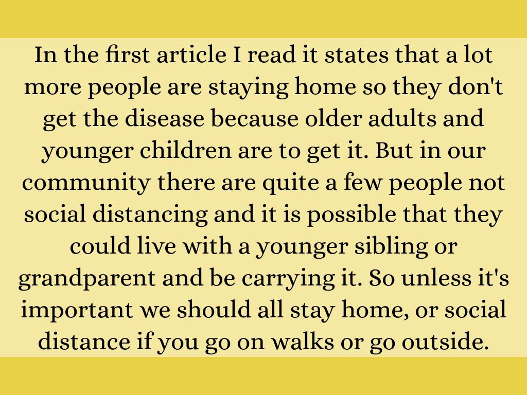 In the first article I read it states that a lot more people are staying home so they don't get the disease because older adults and younger children are to get it. But in our community there are quite a few people not social distancing and it is possible that they could live with a younger sibling or grandparent and be carrying it. So unless it's important we should all stay home, or social distance if you go on walks or go outside.