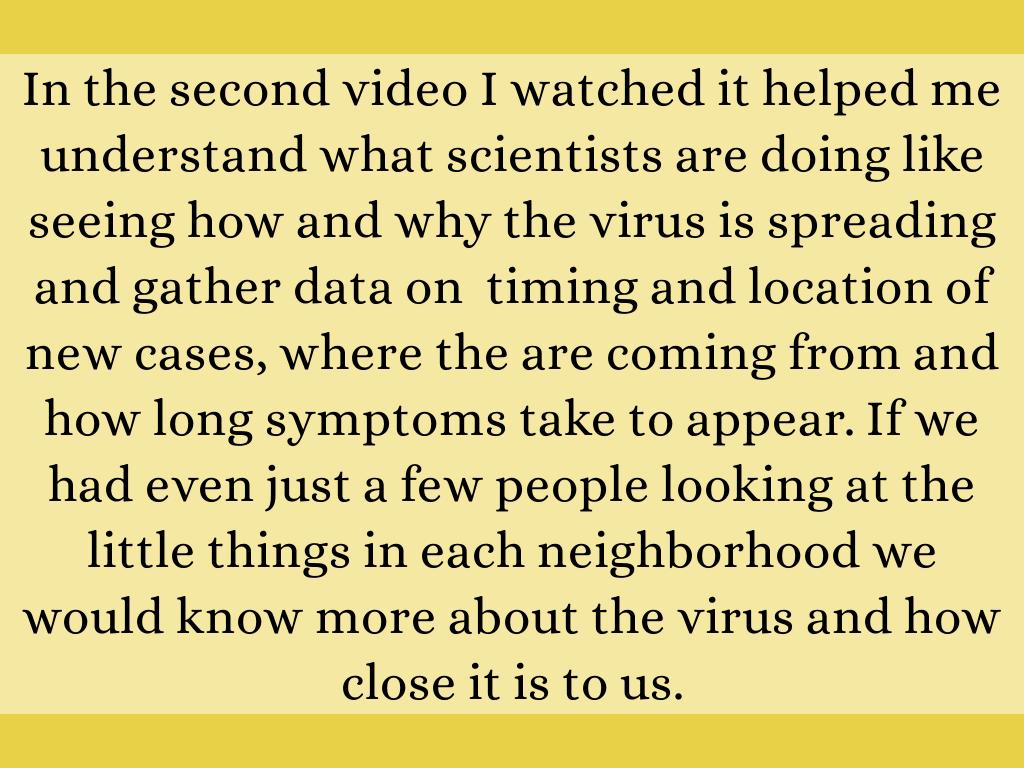 In the second video I watched it helped me understand what scientists are doing like seeing how and why the virus is spreading and gather data on timing and location of new cases, where the are coming from and how long symptoms take to appear. If we had even just a few people looking at the little things in each neighborhood we would know more about the virus and how close it is to us.
