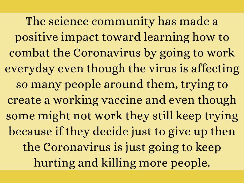 The science community has made a positive impact toward learning how to combat the Coronavirus by going to work everyday even though the virus is affecting so many people around them, trying to create a working vaccine and even though some might not work they still keep trying because if they decide just to give up then the Coronavirus is just going to keep hurting and killing more people.