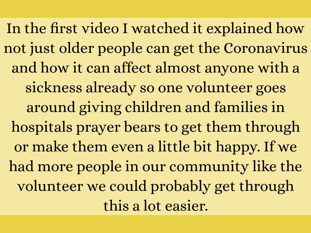 In the first video I watched it explained how not just older people can get the Coronavirus and how it can affect almost anyone with a sickness already so one volunteer goes around giving children and families in hospitals prayer bears to get them through or make them even a little bit happy. If we had more people in our community like the volunteer we could probably get through this a lot easier.
