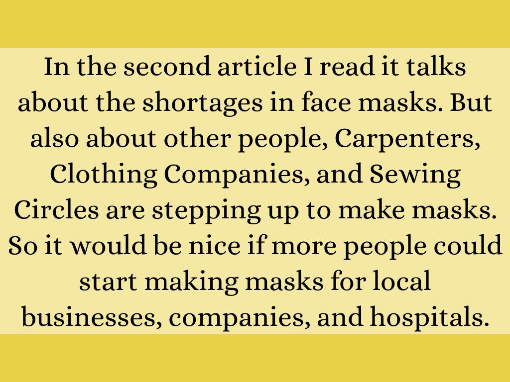 In the second article I read it talks about the shortages in face masks. But also about other people, Carpenters, Clothing Companies, and Sewing Circles are stepping up to make masks. So it would be nice if more people could start making masks for local businesses, companies, and hospitals.