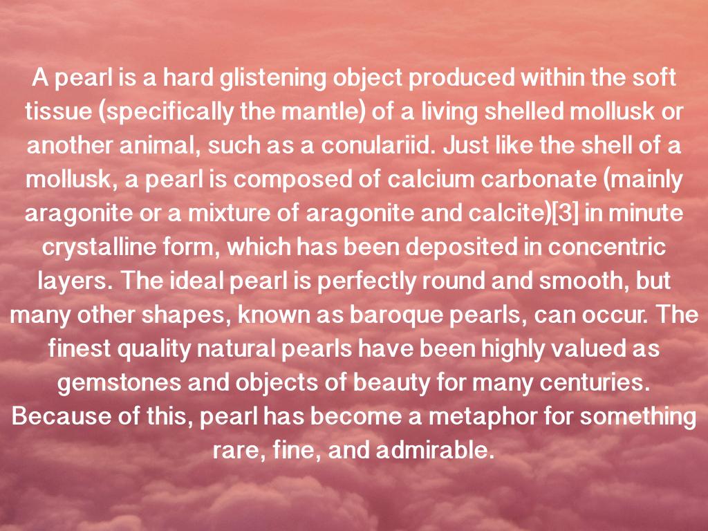 A pearl is a hard glistening object produced within the soft tissue (specifically the mantle) of a living shelled mollusk or another animal, such as a conulariid. Just like the shell of a mollusk, a pearl is composed of calcium carbonate (mainly aragonite or a mixture of aragonite and calcite)[3] in minute crystalline form, which has been deposited in concentric layers. The ideal pearl is perfectly round and smooth, but many other shapes, known as baroque pearls, can occur. The finest quality natural pearls have been highly valued as gemstones and objects of beauty for many centuries. Because of this, pearl has become a metaphor for something rare, fine, and admirable.