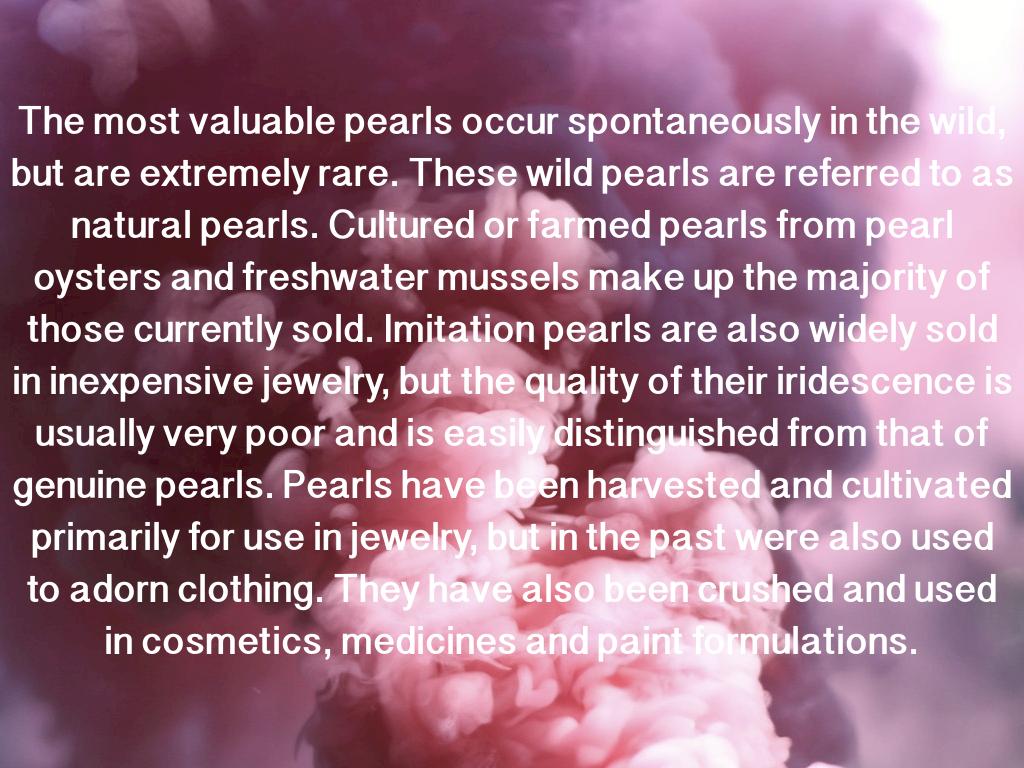 The most valuable pearls occur spontaneously in the wild, but are extremely rare. These wild pearls are referred to as natural pearls. Cultured or farmed pearls from pearl oysters and freshwater mussels make up the majority of those currently sold. Imitation pearls are also widely sold in inexpensive jewelry, but the quality of their iridescence is usually very poor and is easily distinguished from that of genuine pearls. Pearls have been harvested and cultivated primarily for use in jewelry, but in the past were also used to adorn clothing. They have also been crushed and used in cosmetics, medicines and paint formulations.