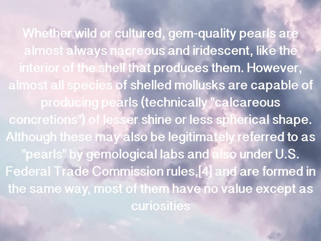Whether wild or cultured, gem-quality pearls are almost always nacreous and iridescent, like the interior of the shell that produces them. However, almost all species of shelled mollusks are capable of producing pearls (technically "calcareous concretions") of lesser shine or less spherical shape. Although these may also be legitimately referred to as "pearls" by gemological labs and also under U.S. Federal Trade Commission rules,[4] and are formed in the same way, most of them have no value except as curiosities
