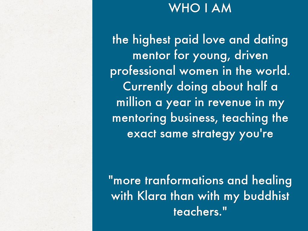 the highest paid love and dating mentor for young, driven professional women in the world. Currently doing about half a million a year in revenue in my mentoring business, teaching the exact same strategy you're