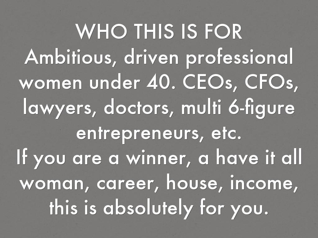 Ambitious, driven professional women under 40. CEOs, CFOs, lawyers, doctors, multi 6-figure entrepreneurs, etc.