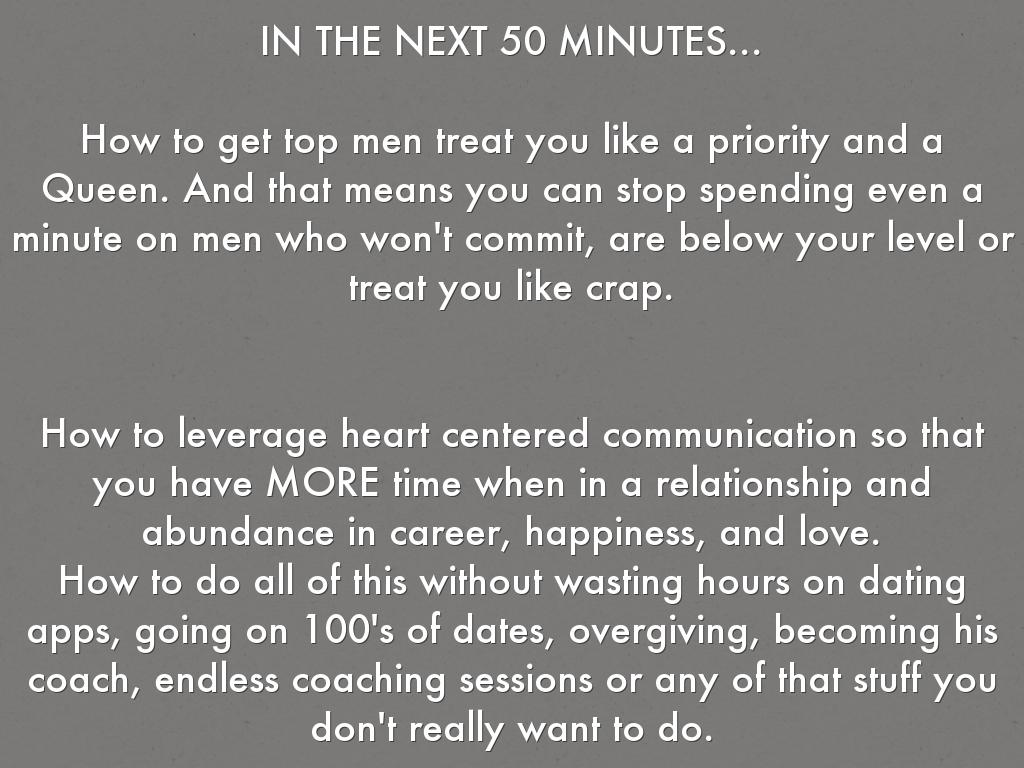 How to get top men treat you like a priority and a Queen. And that means you can stop spending even a minute on men who won't commit, are below your level or treat you like crap.