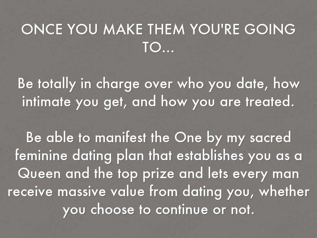 Be able to manifest the One by my sacred feminine dating plan that establishes you as a Queen and the top prize and lets every man receive massive value from dating you, whether you choose to continue or not.