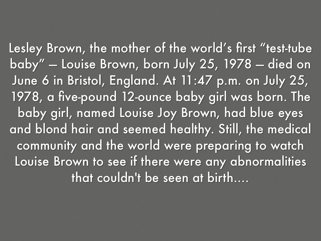 Lesley Brown, the mother of the world’s first “test-tube baby” — Louise Brown, born July 25, 1978 — died on June 6 in Bristol, England. At 11:47 p.m. on July 25, 1978, a five-pound 12-ounce baby girl was born. The baby girl, named Louise Joy Brown, had blue eyes and blond hair and seemed healthy. Still, the medical community and the world were preparing to watch Louise Brown to see if there were any abnormalities that couldn't be seen at birth.