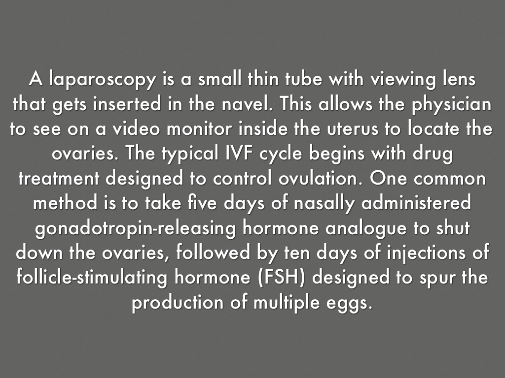 A laparoscopy is a small thin tube with viewing lens that gets inserted in the navel. This allows the physician to see on a video monitor inside the uterus to locate the ovaries. The typical IVF cycle begins with drug treatment designed to control ovulation. One common method is to take five days of nasally administered gonadotropin-releasing hormone analogue to shut down the ovaries, followed by ten days of injections of follicle-stimulating hormone (FSH) designed to spur the production of multiple eggs.